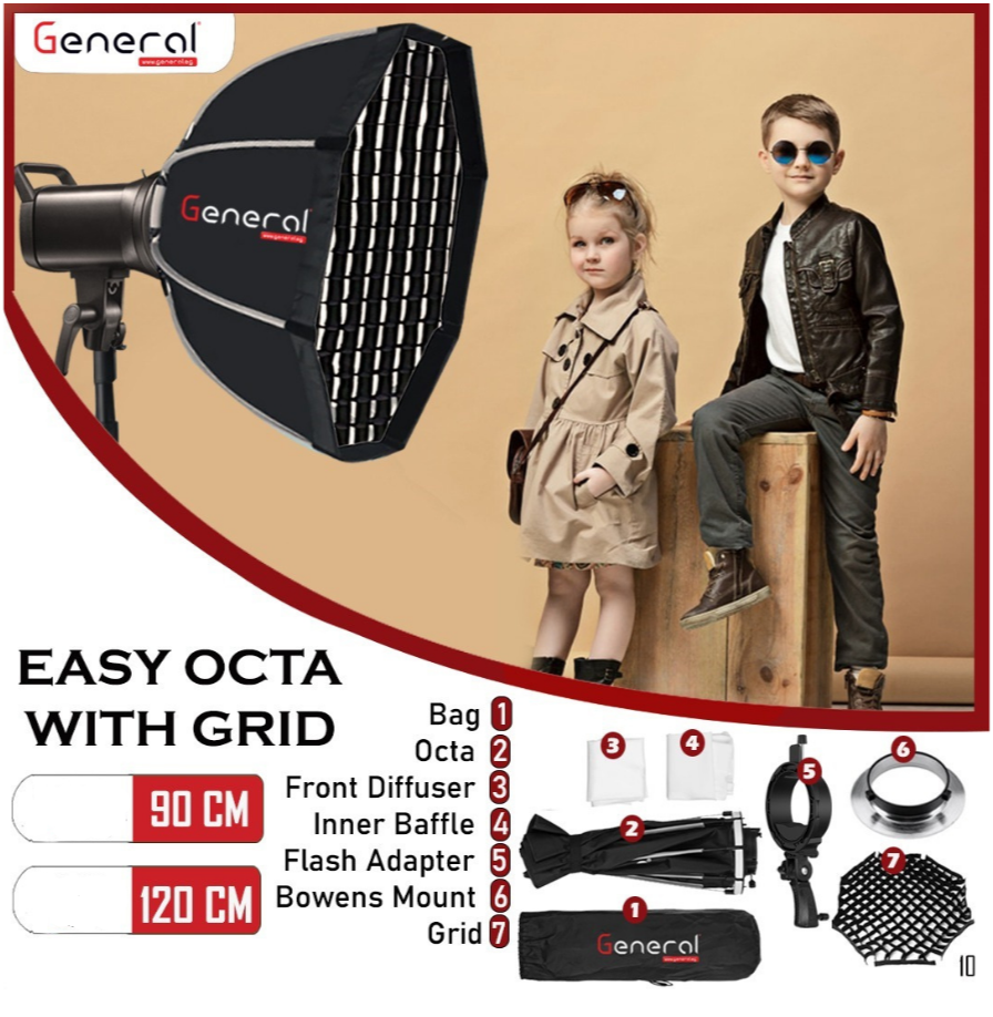 General OCTA SOFTBOX for head Overview Professional, high quality 8-pole 90cm foldable octagon soft box. to open it for usage and fold it for storage, with a nylon carrying bag, very portable. It adopts superior fabrics with exquisite workmanship and fine crease resistance, reflective effect is better. With white soft cloth, make light soft and even. Full metal supporting poles are very sturdy and durable, with a certain degree of toughness, meeting the requirements of arc-shaped frame for the soft box. With standard S mount, it is compatible with various studio flashes and other accessories with S mount. Widely used, the soft box makes it desirable for fashion photography, portrait photography and medium to large sized product shoot in.