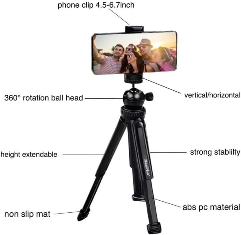 The Neepho NP-999 is a multi-function tripod designed for high stability while shooting with both phones and cameras. With its compact size of 5947296mm and light weight of 249g, it is the perfect choice for photographers and creators who need a portable yet effective tool.