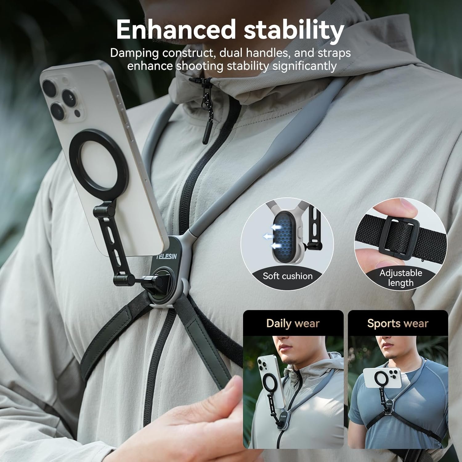 【What’s in the Package?】 TELESIN° 2024 new MAX magnetic cellphone neck mount set includes 1 x MAX Magnetic Neck Mount, 1 x Magnetic Piece ( Using for smartphones without magnetism ), 1 x Cleaning Kit ( Using for wiping the phone case of a cell phone without magnetism before attaching the magnetic piece to the case ), 1 x Anti-Lost Rope, 1x Anti-shake Chest Strap, 1 x Specification