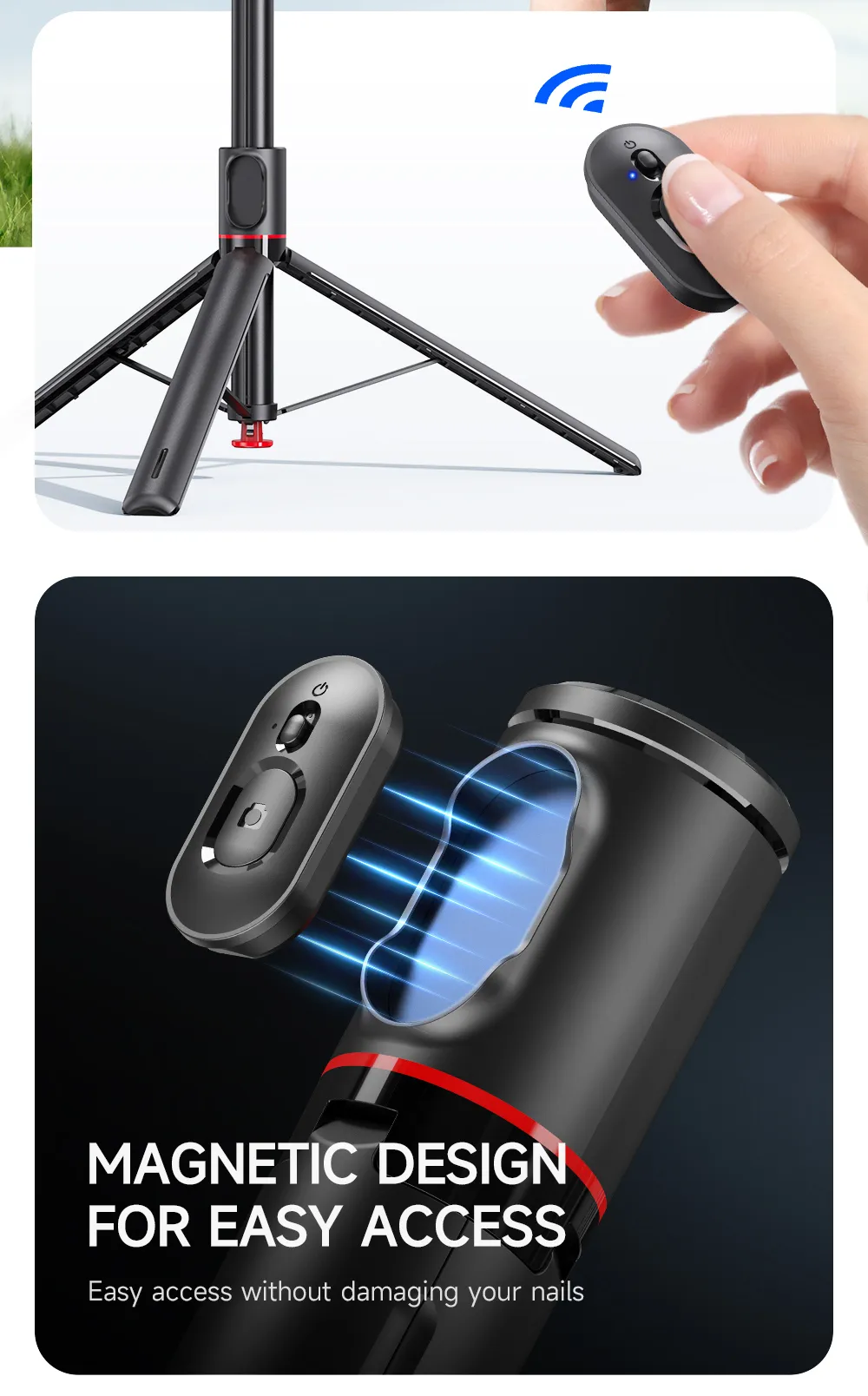 2.Magnetic remote control, easy to hold.Pamper your nails.Bluetooth remote control, free your hands.